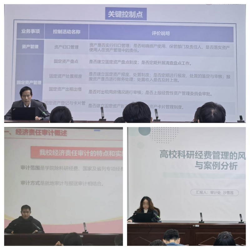 审计处选派业务骨干组建宣讲团队,由谢建明科长、彭鹏科长、沙雪莲老师分别围绕核心业务领域展开深度解读。领导干部经济责任审计专题中,彭鹏科长详细阐述了领导干部经济责任的内涵、审计流程、审计重点关注领域以及常见问题等内容。谢建明科长针对合同管理、资产管理、预算管理、采购管理等内控评价中的重点领域,系统揭示业务流程中的风险点,解读近几年内控评价中发现的共性问题。科研经费风险防控专题中,沙雪莲老师深度剖析了多个审计发现问题案例,涉及预算管理与执行、设备费、测试加工费、差旅会议费等9个重点关注领域。